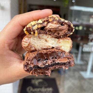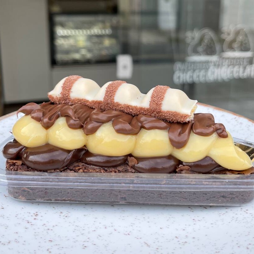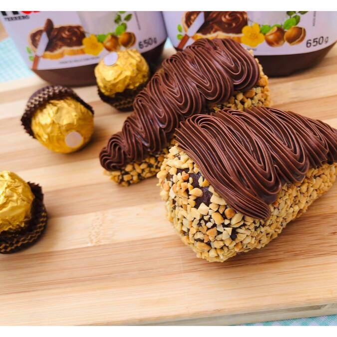 Massa artesanal de chocolate, brigadeiro cremoso e pra finalizar nossa massa folhada crocante envolta em uma deliciosa ganache de Nutella.