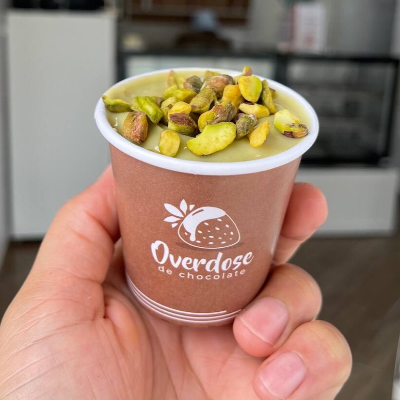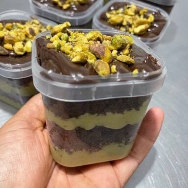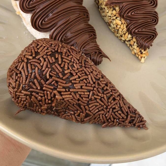 Nossa massa de chocolate artesanal fofinha, brigadeiro de pistache, brigadeiro cremoso ao leite e pedaços de pistache.