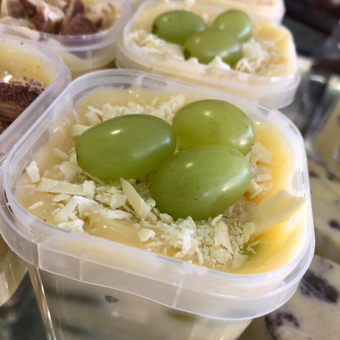 Brigadeiro branco cremoso, pedaço de chocolate nobre e uva selecionada.
