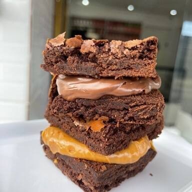 O brownie perfeito existe e combinado com nosso recheio de brigadeiro branco, Nutella e Kinder bueno ele fica ainda mais indescritível.