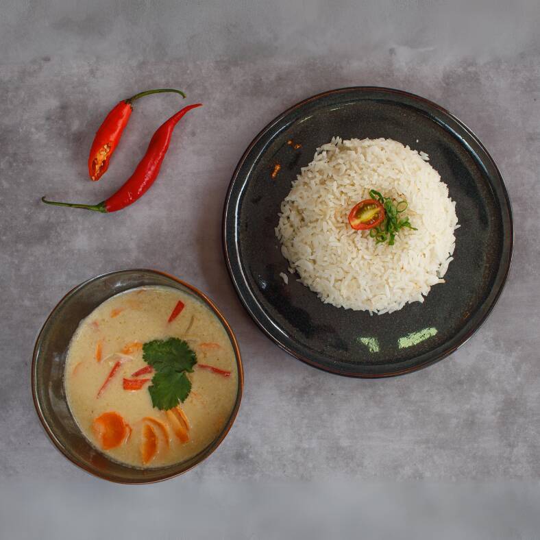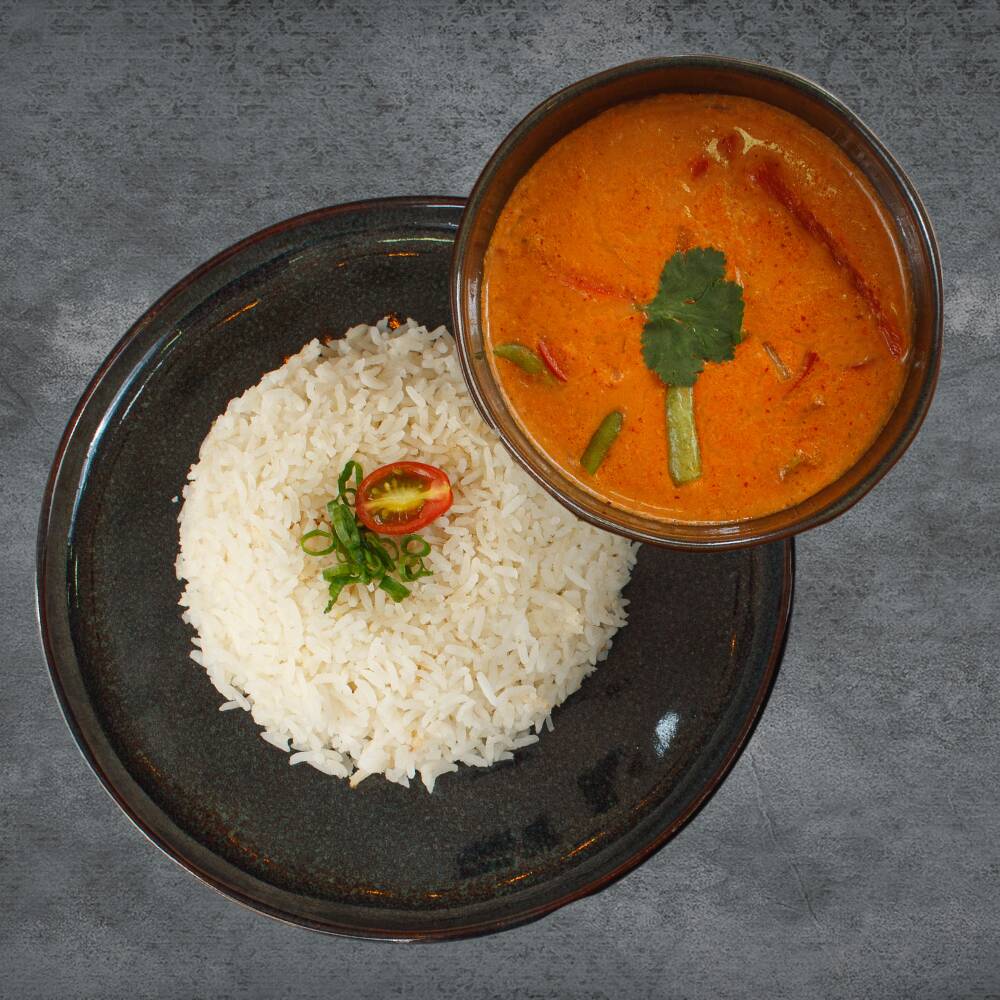 Curry vermelho/ chalotas/ gengibre/ sal/ alho/ folhas de limão kaffir/ sementes de coentro/ leite de coco/ vagem/ legumes/ pimentão/ manjericão.