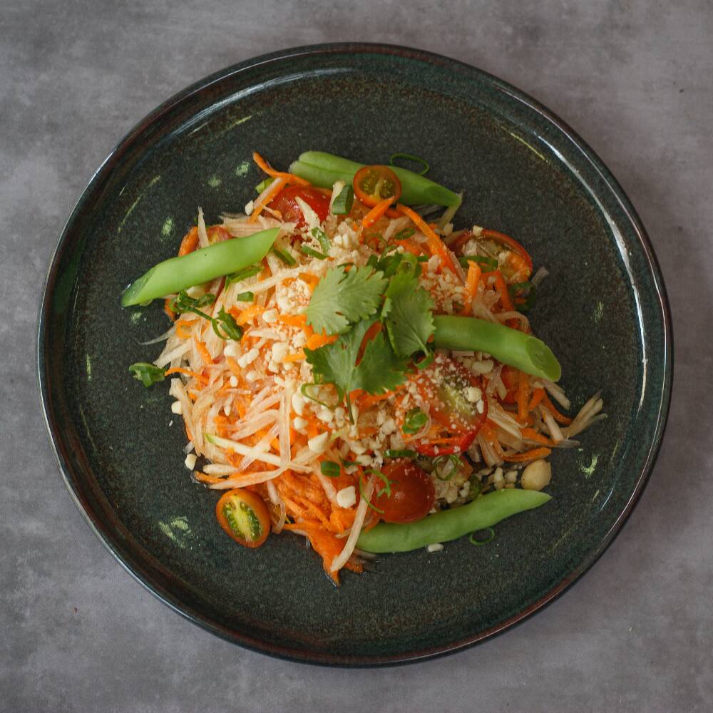 Papaya/ vagem/ cenoura/ tomate/ alho/ tamarindo e limão/ molho de peixe/ amendoim. Temos opção vegana.