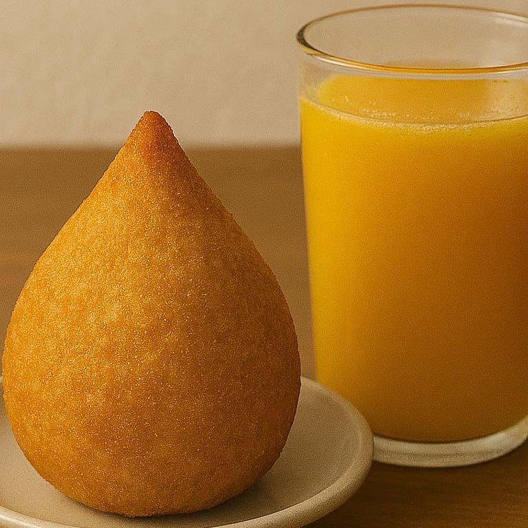 Lanche completo e delicioso! Coxinha dourada, recheada com frango bem temperado + suco de laranja natural, bem gelado.