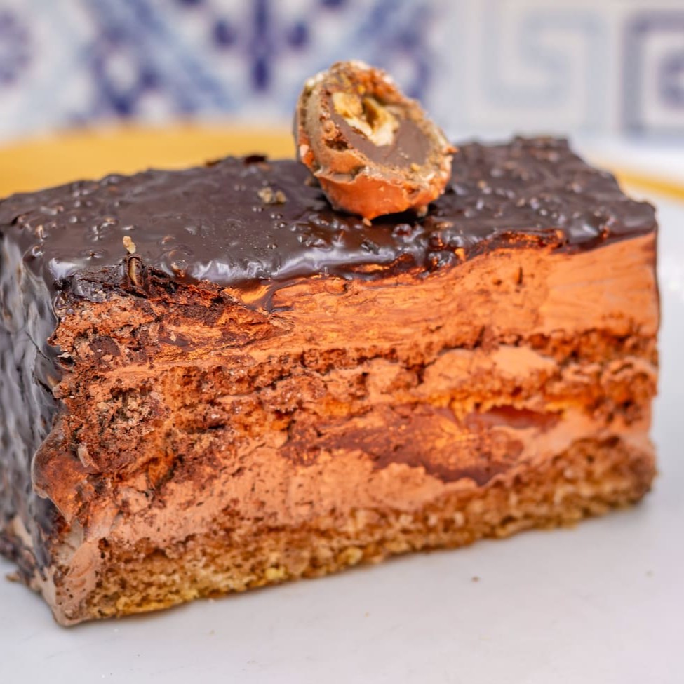 Uma fatia do nosso Bolo Gelado de Ferrero Rocher, um verdadeiro hino à indulgência. Harmoniosa combinação de sabores ricos e texturas luxuosas.