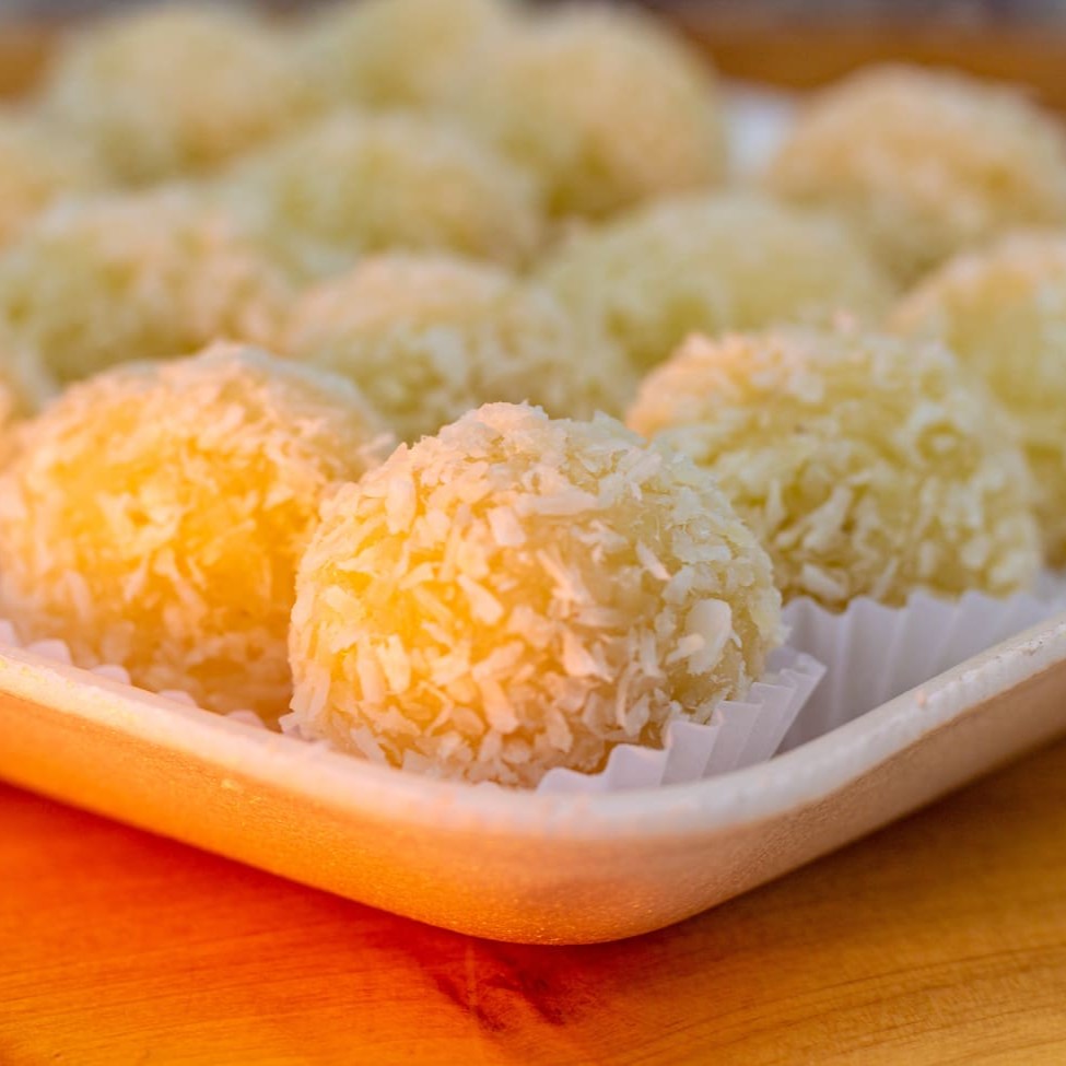 Docinho com recheio cremoso e suave, envolto em coco ralado fresquinho, que derrete na boca.