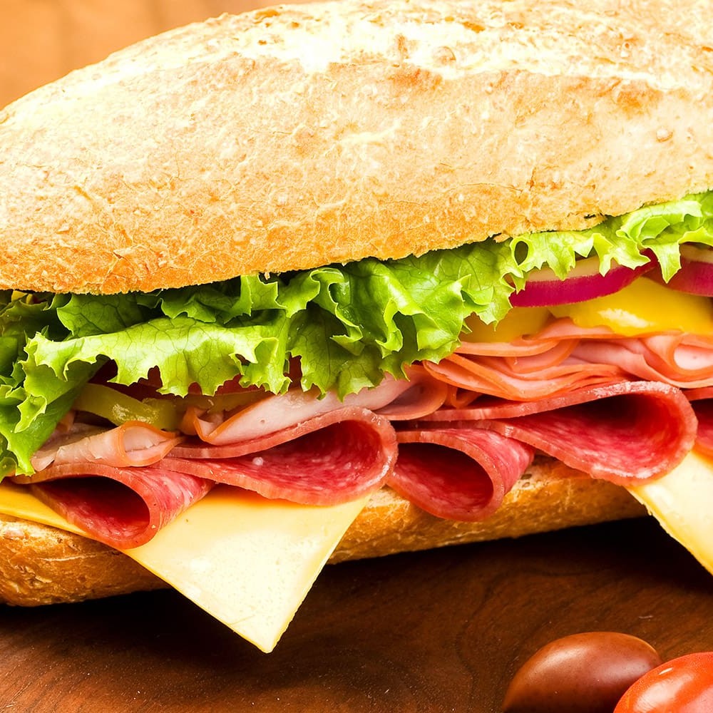 Lanche especial de presunto parma, queijo prato, alface, tomate e maionese.