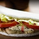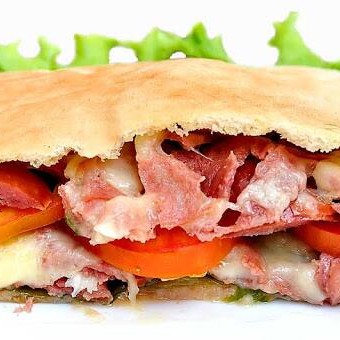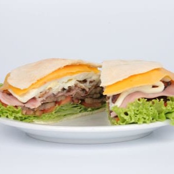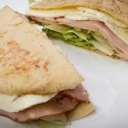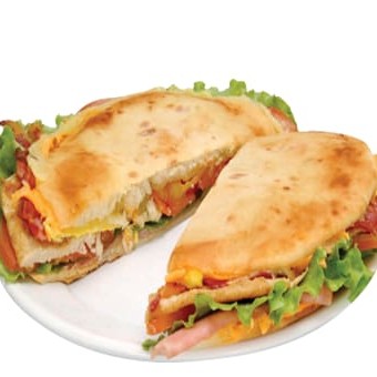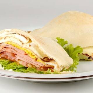 Beirute de peito de peru no pão sírio com mozarela, ovo, bacon, alface, tomate, maionese e orégano.