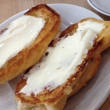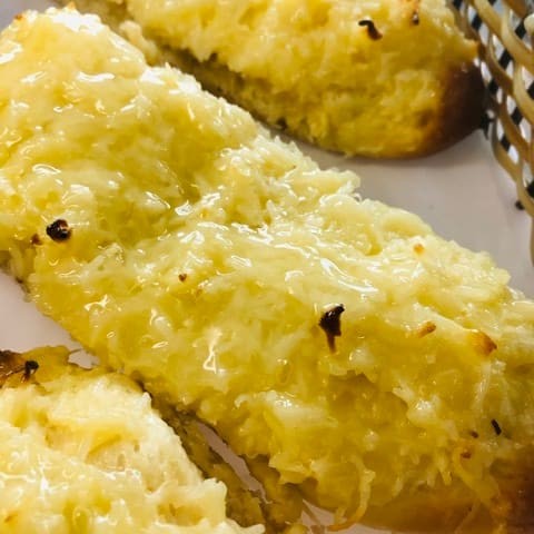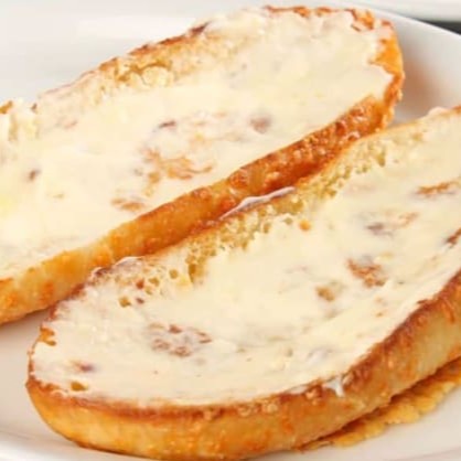 Pão francês na chapa com requeijão na saída.