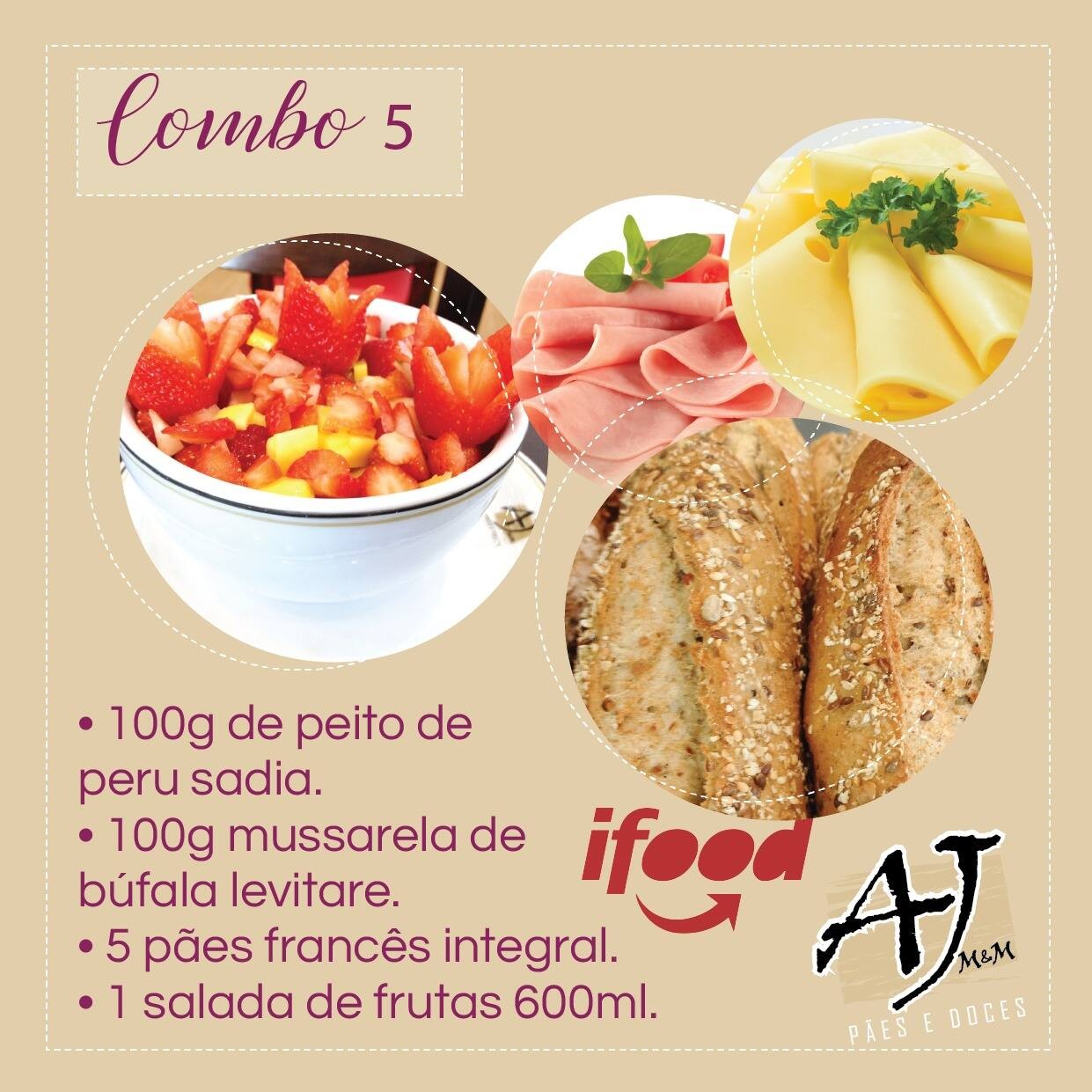 Nosso combo 5 light é composto por: 100g de peito de peru sadia. 100g mussarela de búfala levitare. 5 pães francês integral. 1 salada de frutas 600ml.