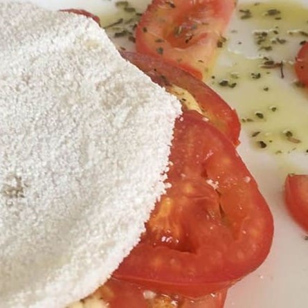 Tapioca mineira recheada com queijo branco, tomate e orégano.