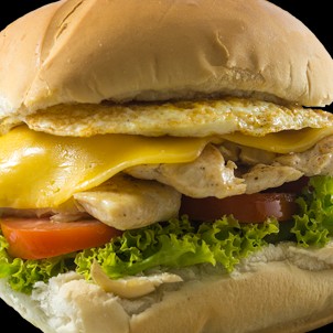 Beirute de filé de frango no pão sírio com mozarela, ovo, bacon, alface, tomate, maionese e orégano.