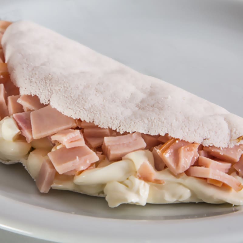 Tapioca mista recheada com presunto e queijo.