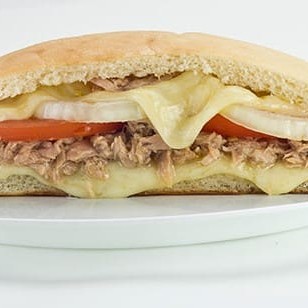 Beirute de atum com cebola no pão sírio com mozarela, ovo, bacon, alface, tomate, maionese e orégano.
