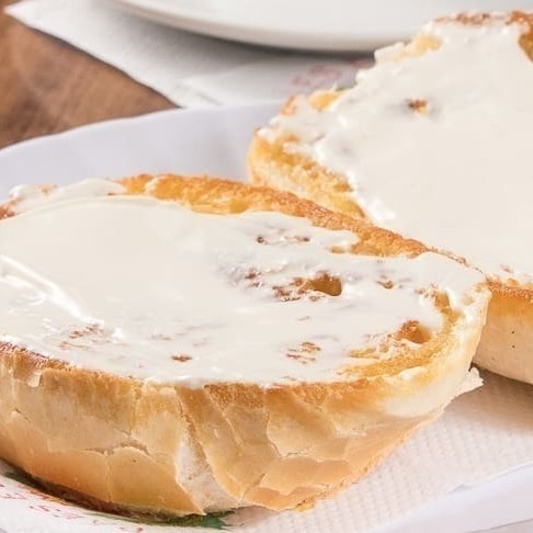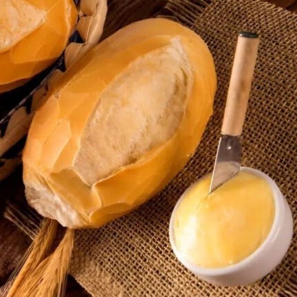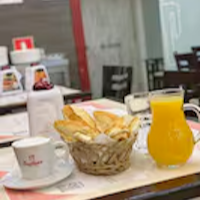 • Pão com manteiga na chapa • café coador médio • suco de laranja