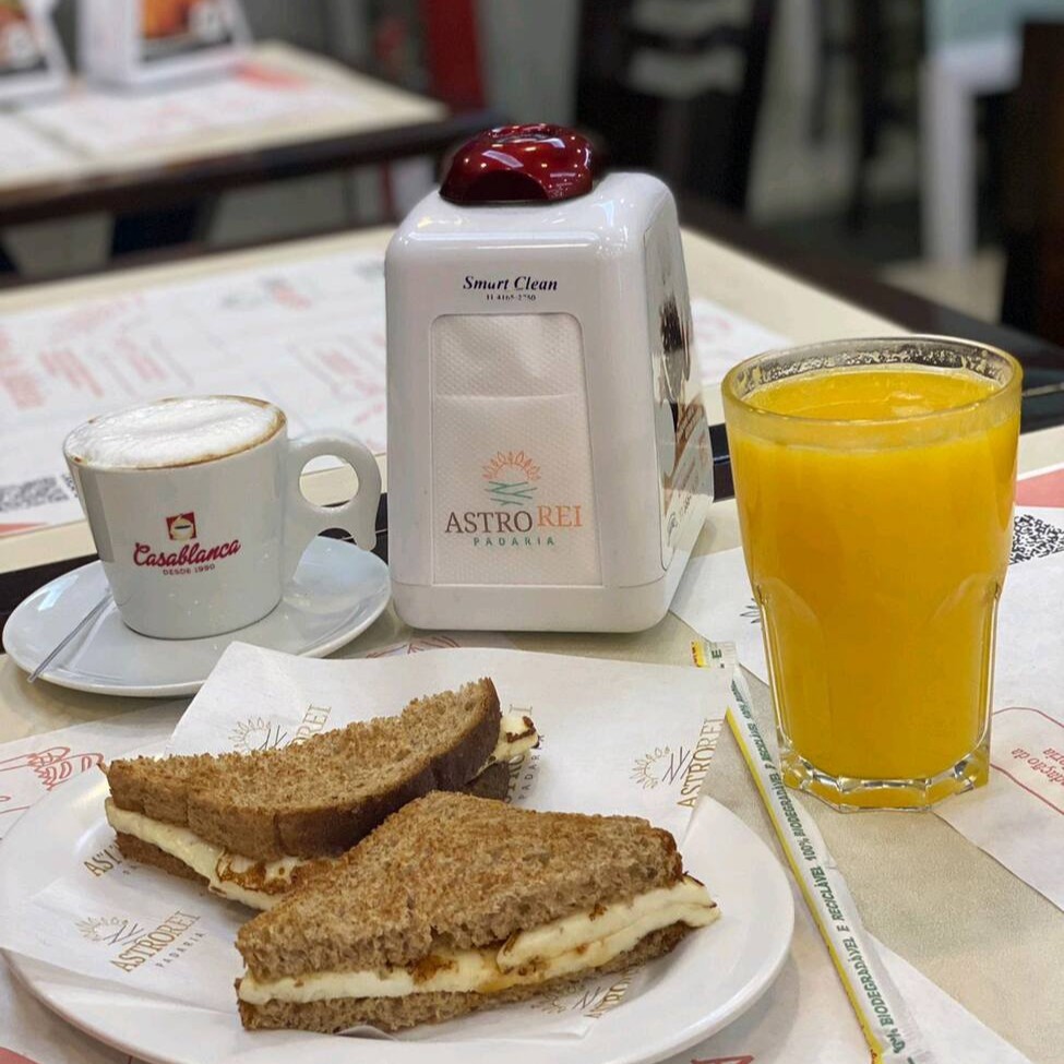 • Lanche de queijo branco • café coador médio • suco de laranja
