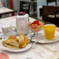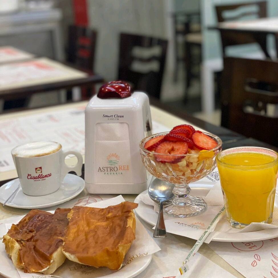 • Pão com manteiga na chapa • salada de frutas • café coador médio • suco de laranja