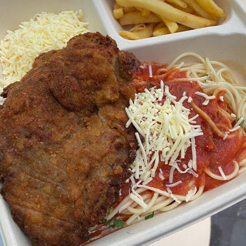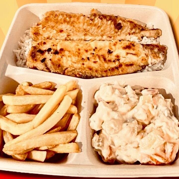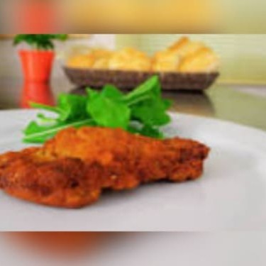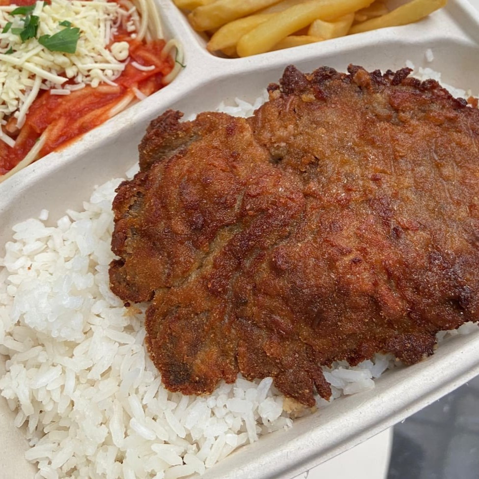 1 filé mignon empanado. Acompanha arroz branco e Fritas.