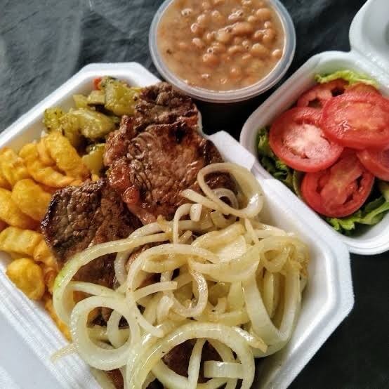 Acompanha arroz, feijão, salada, batata frita e farofa. Marmitex