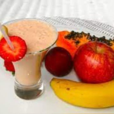Banana, Maçã, Mamão, Abacate batidos com leite fresco
