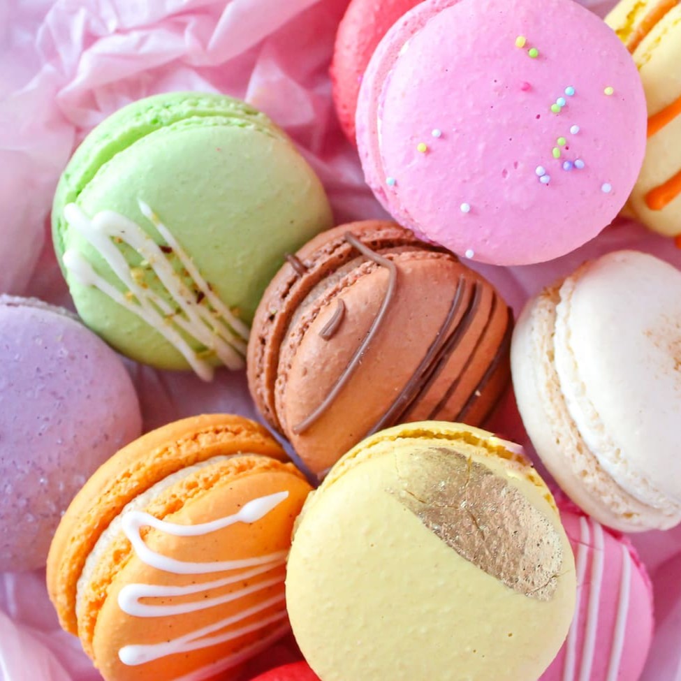 Pequenos e coloridos sanduíches de merengue, feitos com farinha de amêndoa.