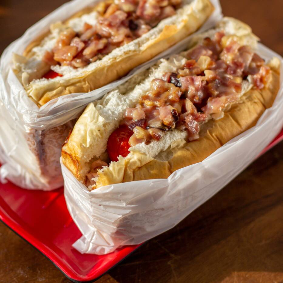 Dois lanches saborosos com um precinho mais especial! Leva calabresa temperada, purê cremoso, vinagrete fresquinho e a crocância da batata palha com couve frita. A maionese caseira e os grãos (ervilha e milho) completam o sabor, tudo no pão quentinho.