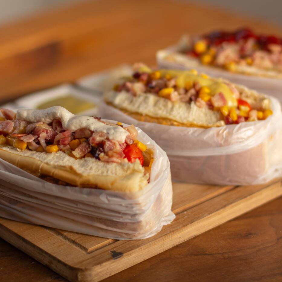 Três lanches saborosos com um preço incrível! Leva calabresa temperada, purê cremoso, vinagrete fresquinho e a crocância da batata palha com couve frita. A maionese caseira e os grãos (ervilha e milho) completam o sabor, tudo no pão quentinho.