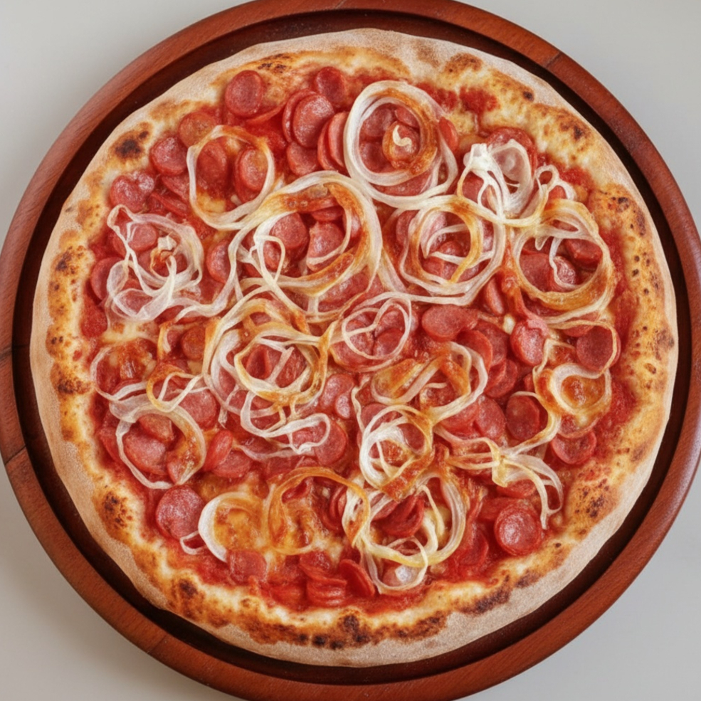 Nessa pizza, os ingredientes são: molho de tomate, calabresa e cebola.
