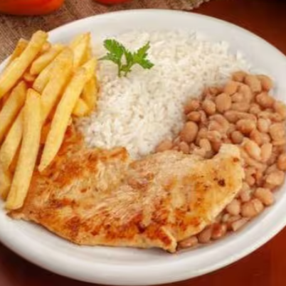 Arroz, feijão file de frango ,batata frita e acompanha salada