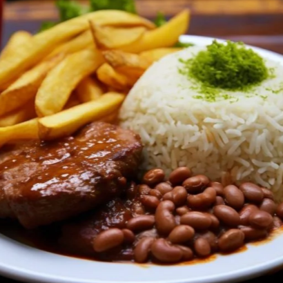 Arroz, feijão, linguiça fresca acebolada ,batata frita e acompanha salada
