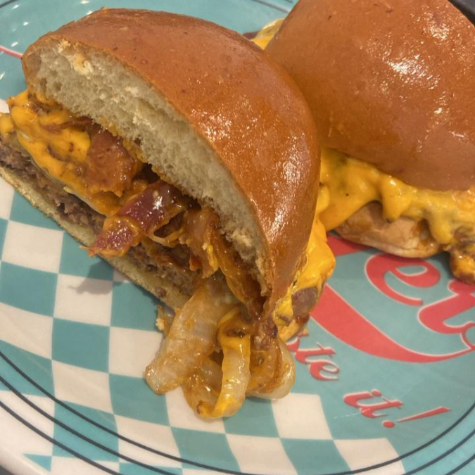 pão de brioche 150gr blend carne bovina, queijo cheddar melted,cebola crispy e bacon