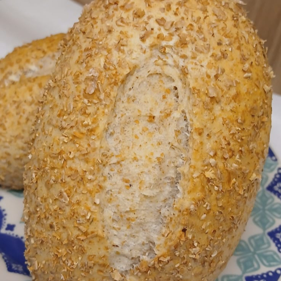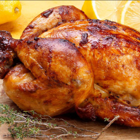 Frango assado acompanha batata e farofa e 10 und de pão francês