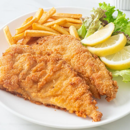 Arroz, feijão, filé de peixe empanado ,batata frita e acompanha salada