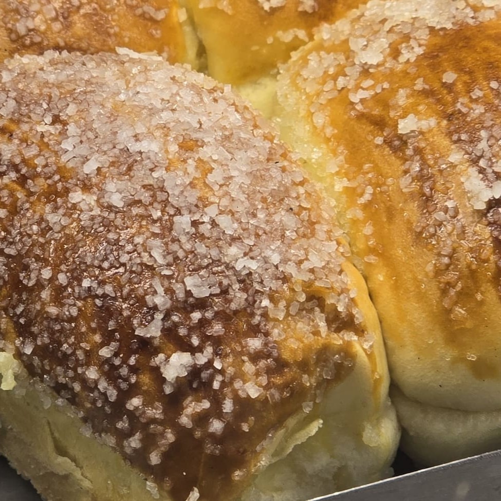 Pão de leite macio com cobertura crocante de açúcar cristal. Ideal para o café da manhã ou lanche.