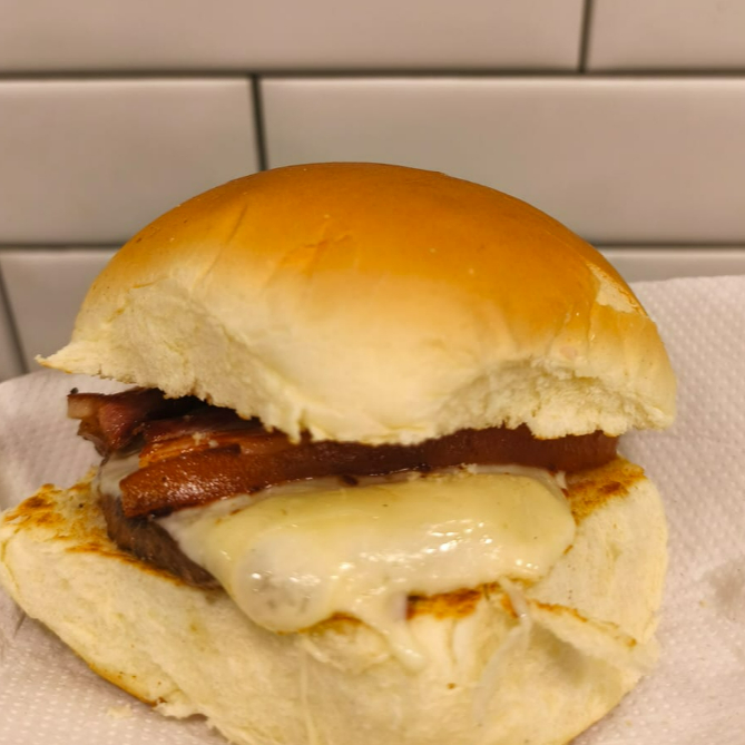 X-Bacon, com hamburguer de carne, bacon,queijo derretido e pão macio. Lanche rápido, hambúrguer clássico, delicioso e perfeito para almoço, jantar ou lanche.