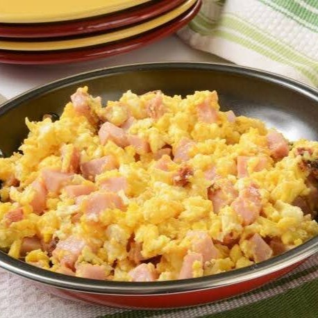 Ovos mexidos com presunto e queijo.