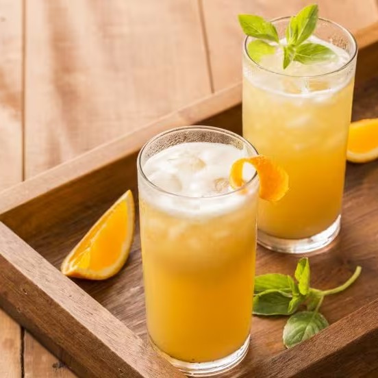 Suco de laranja e cubos de gelo de café