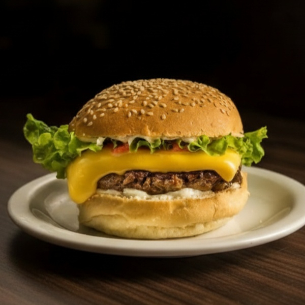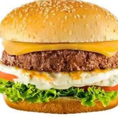 Pão, Hambúrguer, queijo, maionese, e ovo frito.