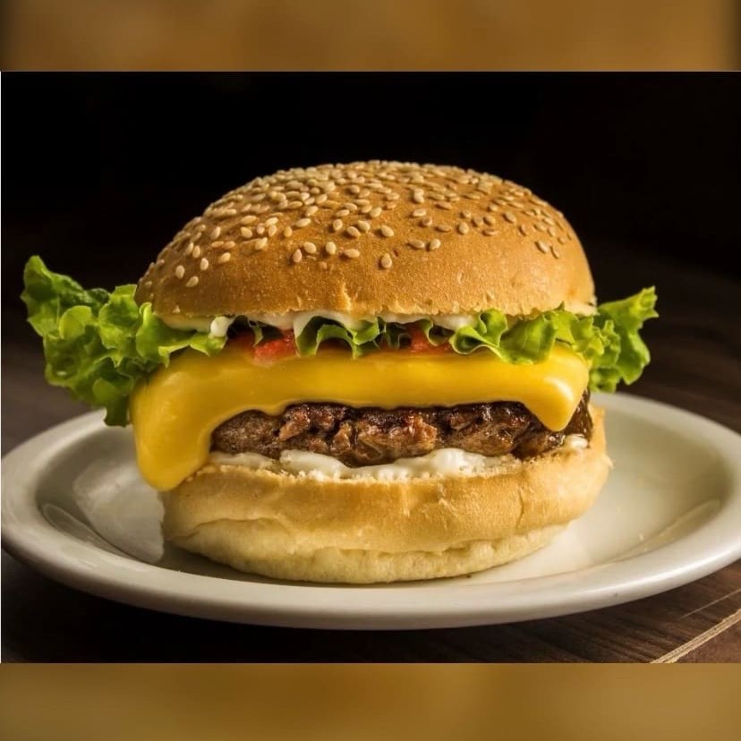 Pão, hambúrguer, queijo, maionese, alface e tomate.