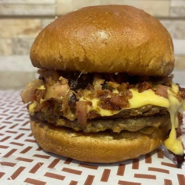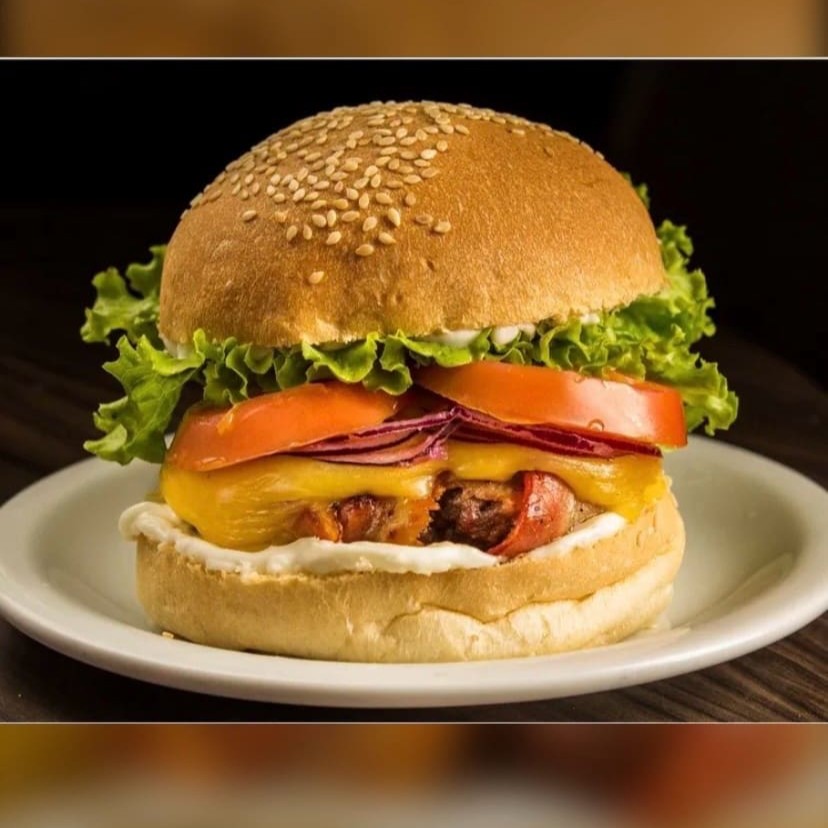 Pão, hambúrguer, queijo, bacon, alface e tomate