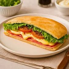 Pão, maionese, presunto, queijo, ovo, alface e tomate.