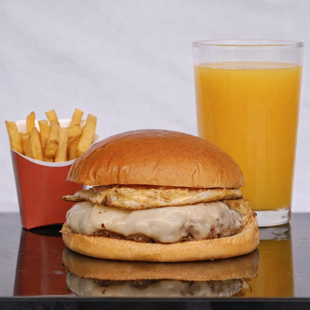 Acompanha uma porção pequena de batata frita, um suco de laranja 300ml e o x egg.