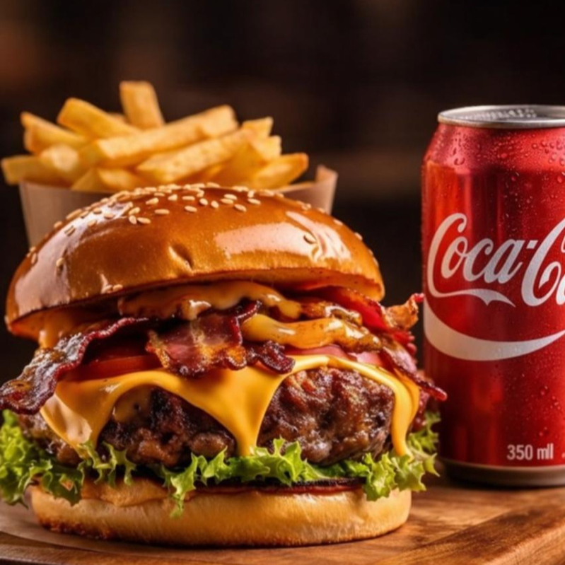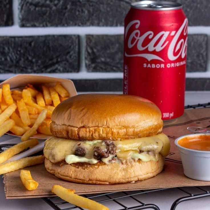 Combo acompanha uma porção pequena de batata frita, uma coca lata 350ml e o x burguer.