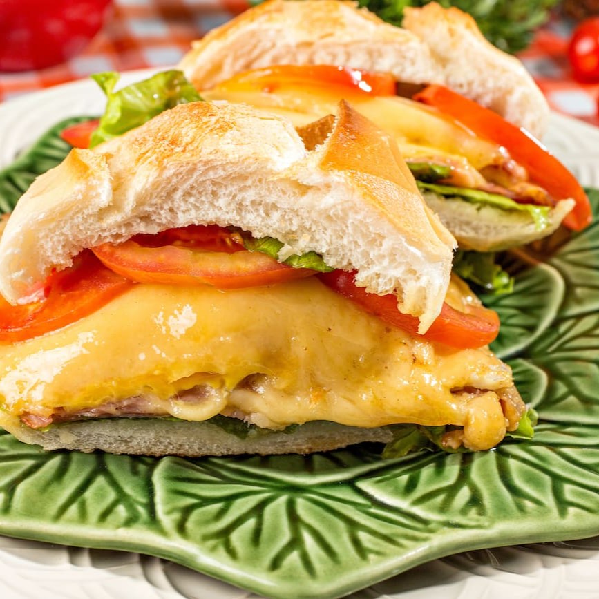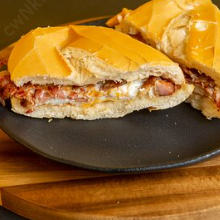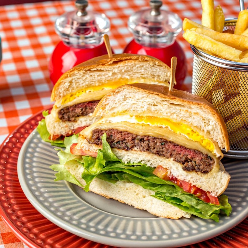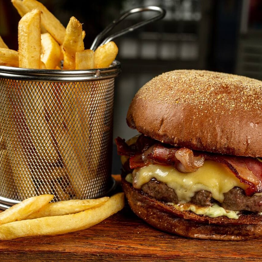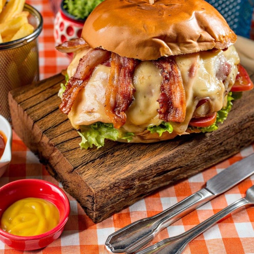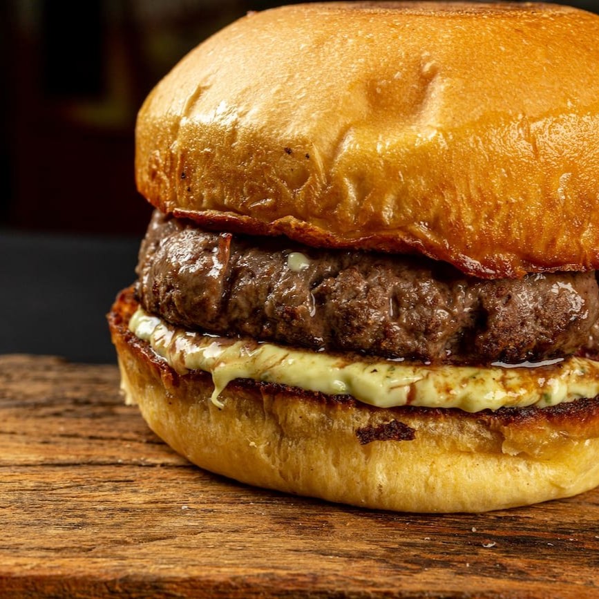 Pão australiano, hambúrguer de picanha, queijo prato, bacon e maionese