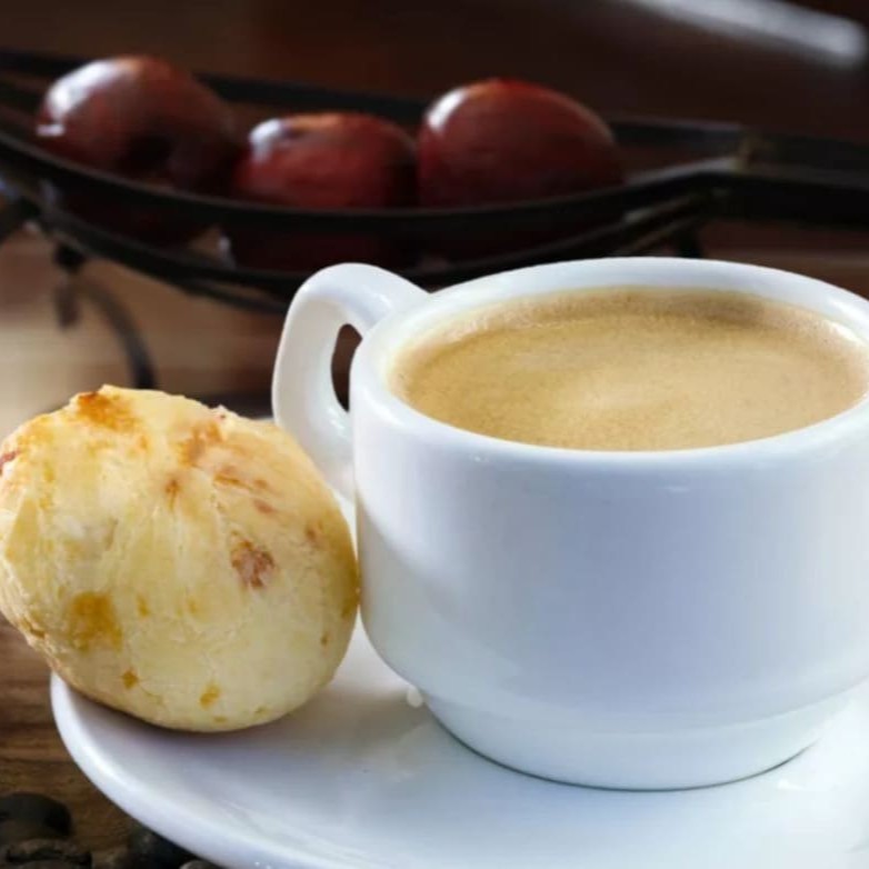 Café com leite 240 ml ,6 pão de queijo,pãozinho com manteiga e suco de laranja