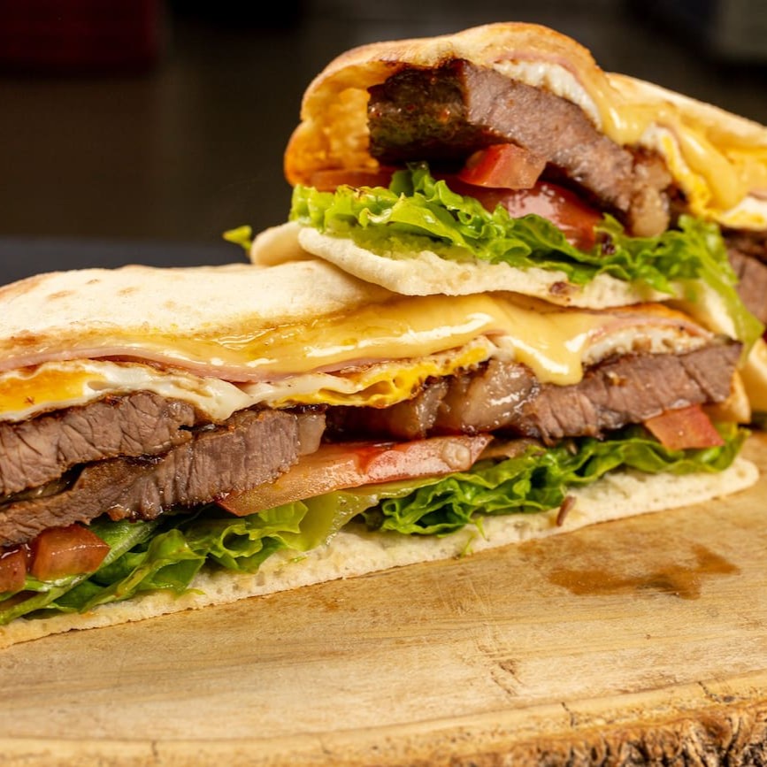 Pão sírío, filé mignon, ovo, maionese, queijo, alface e tomate