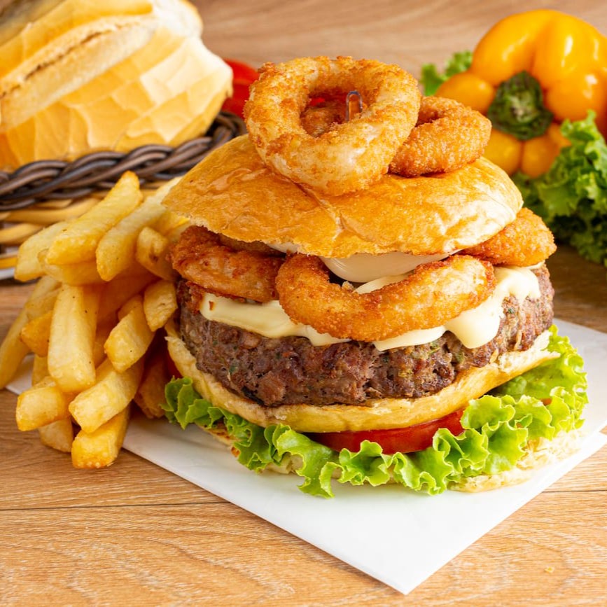 Pão australiano, hambúrguer bovino, cheddar e cebola caramelizada