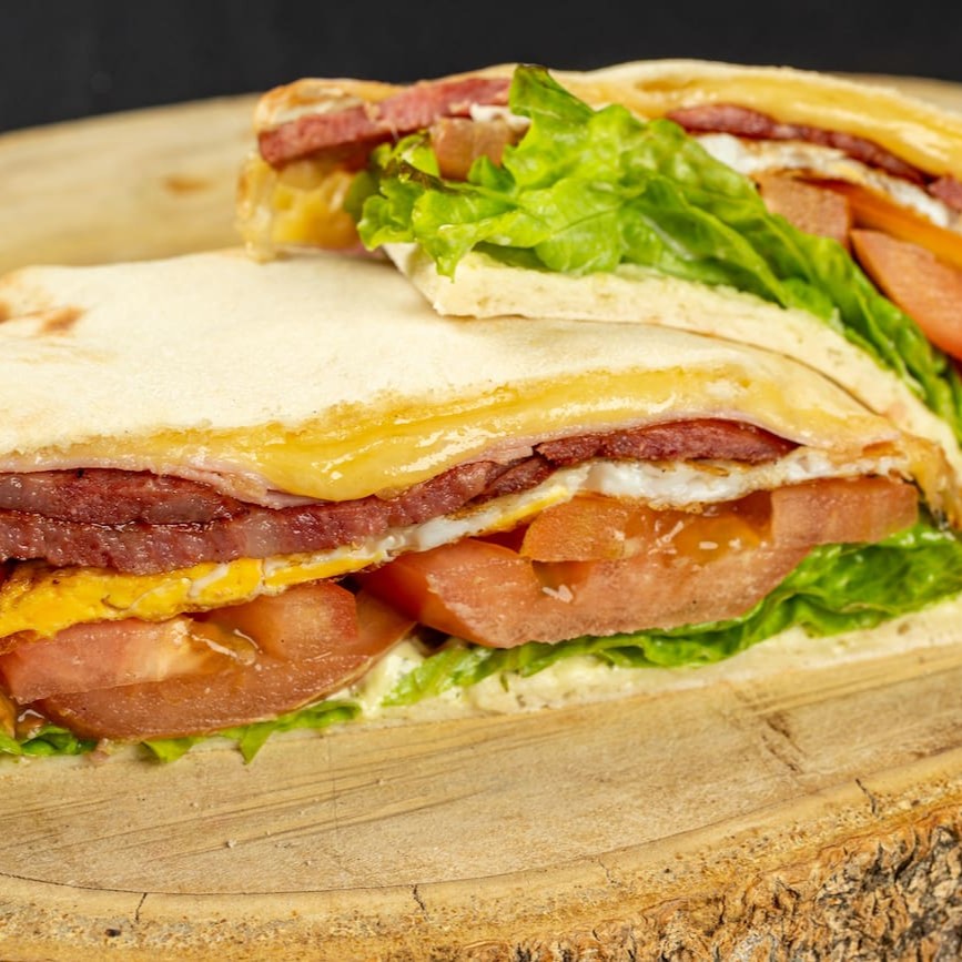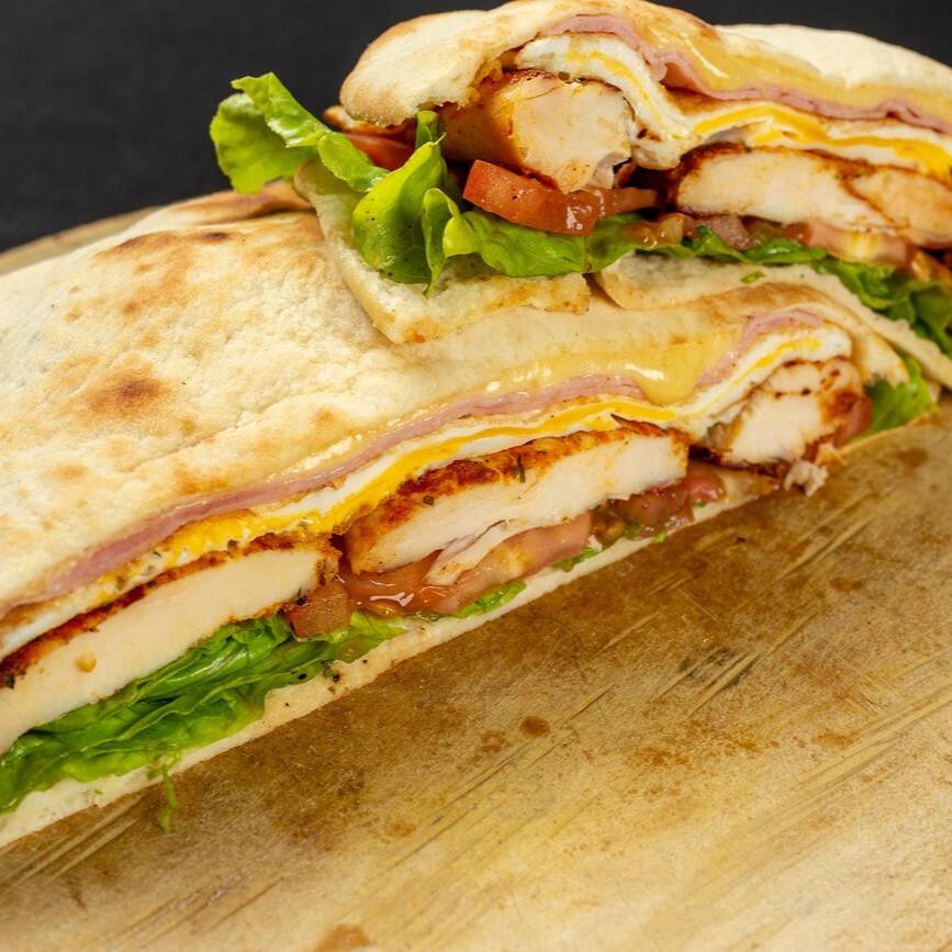 Pão sírío, filé de frango, ovo, maionese, queijo, alface e tomate