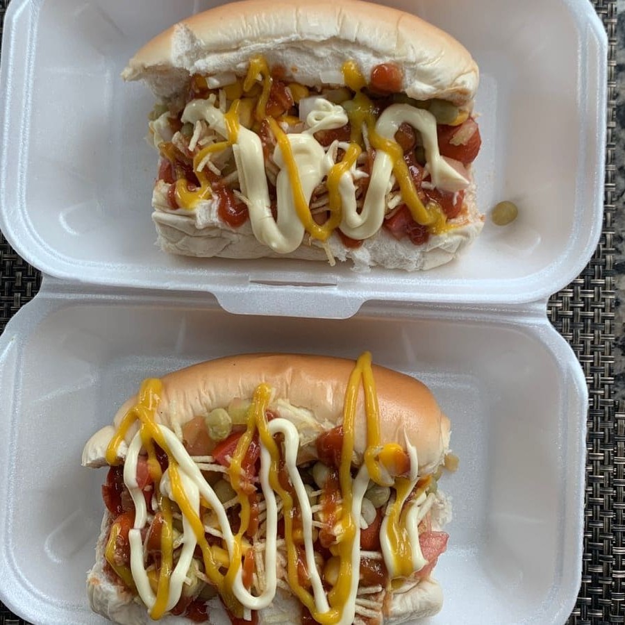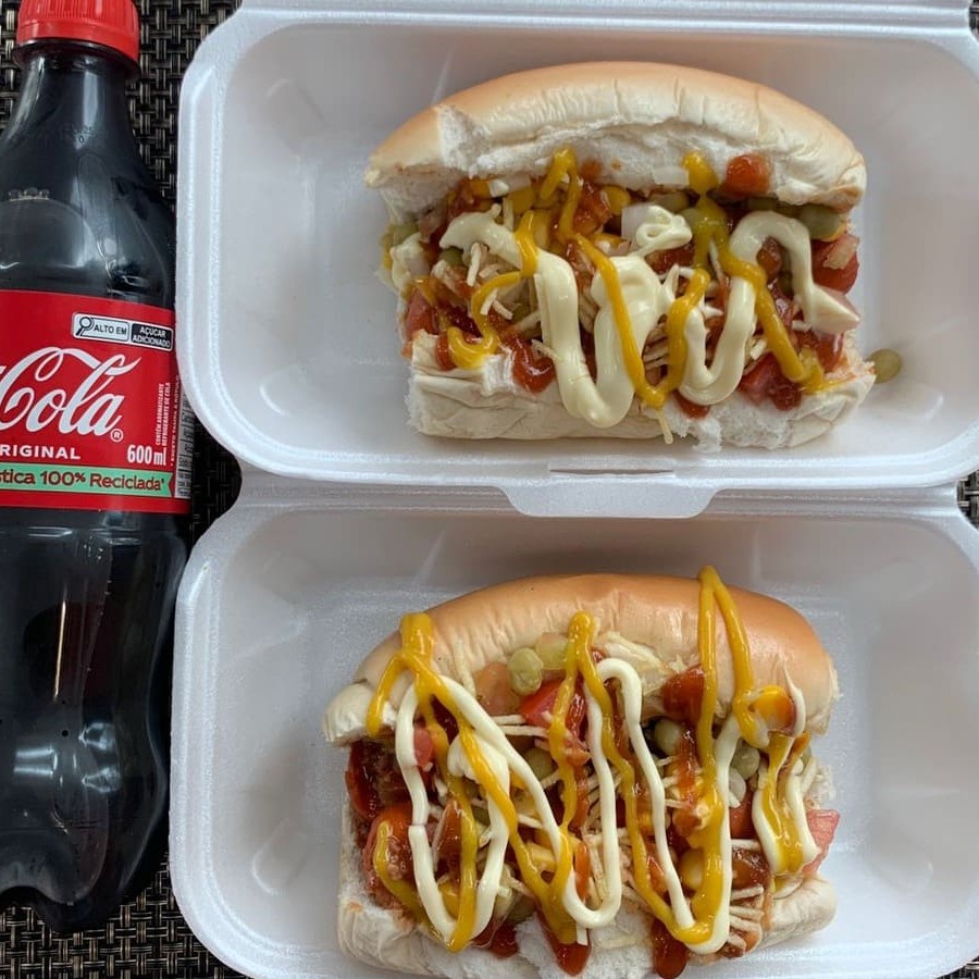 Pão, 2 salsichas, milho, ketchup, mostarda, batata palha, ervilha, maionese e vinagrete.