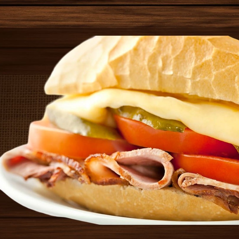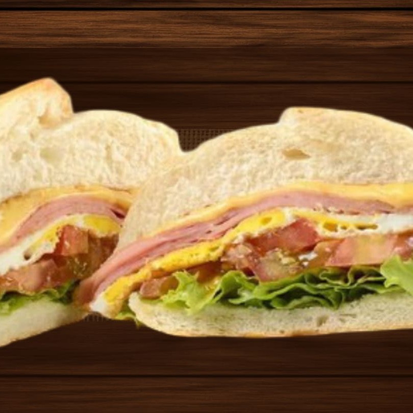 Pão francês, presunto, queijo, ovo, tomate e alface.