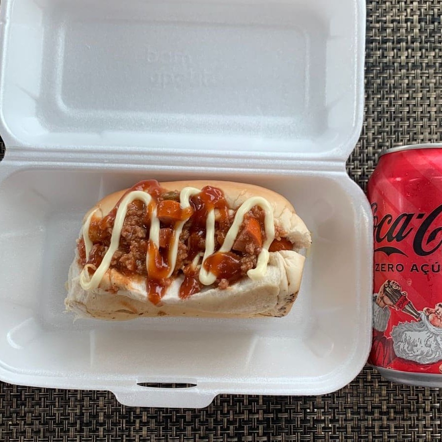 Pão, 2 salsicha, carne moída, milho, ervilha, mostarda, ketchup, batata palha e vinagrete